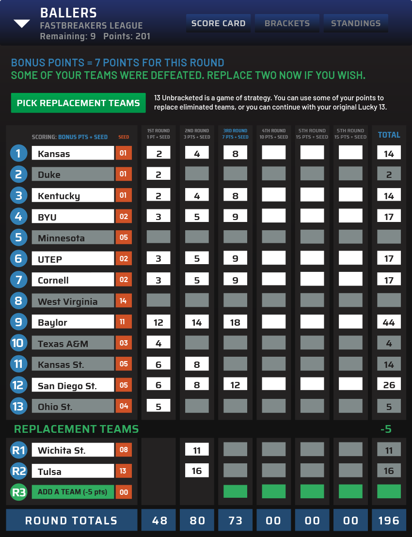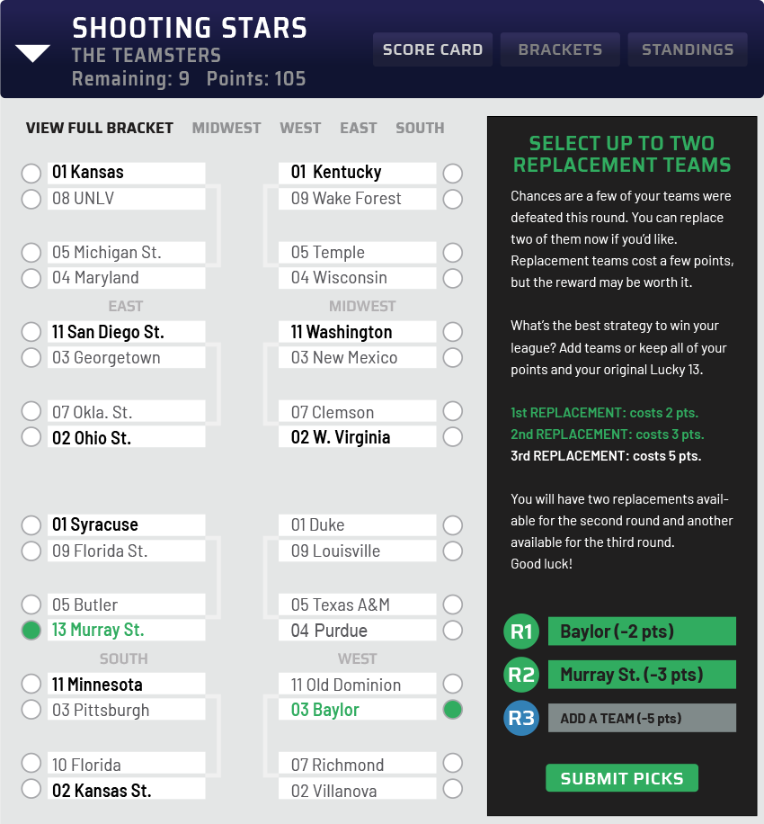 As the tournament progresses and teams are defeated, there are three opportunities to add replacement teams to your original Lucky 13.