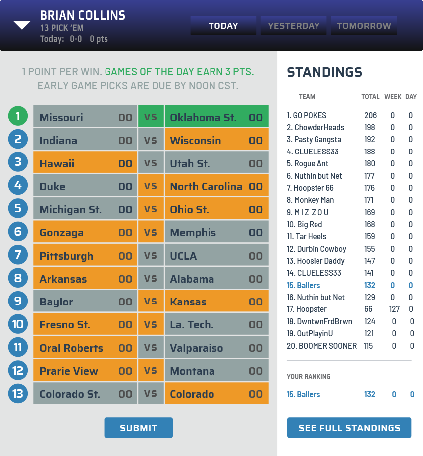 Have your picks in by noon CST each day to ensure you are playing all 13 of the games for that day. Early games need to be selected by noon CST each day. Mid-day games should be selected by 3pm CST, and late games by 6pm CST. So, you can still play some games if you miss the noon cut-off for the early games.