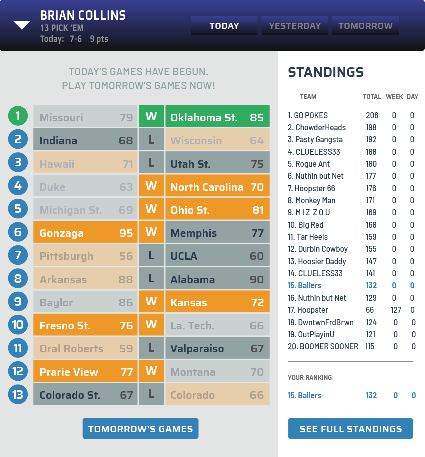13 Pick'Em is a simple but fun way to play along with the day's best sports. Select who you think will win each of the 13 daily matchups.